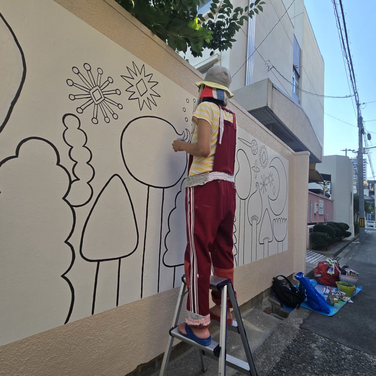 うつぼ幼稚園の壁画を10年ぶりに描いています。