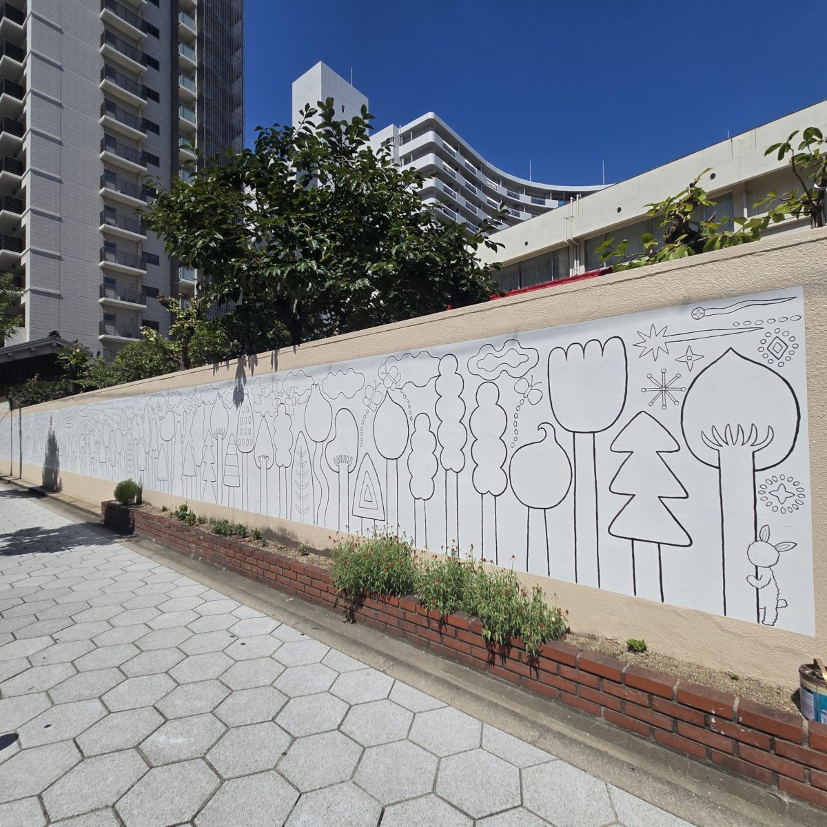 今日はうつぼ幼稚園さんの壁画を園児さんたちに色塗りしてもらいます。晴れてよかった。グッバイモノトーン!